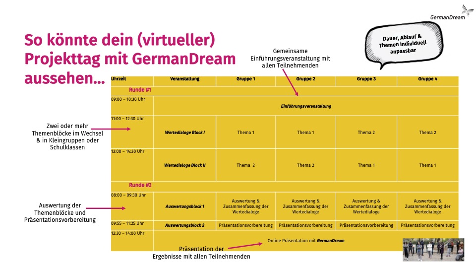Ihr wollt Werte zum Leben erwecken? Ihr wollt nicht nur ein Thema unterbringen, sondern gleich mehrere? Dann ist ein (virtueller) Projekttag mit GermanDream genau das richtige für euch!