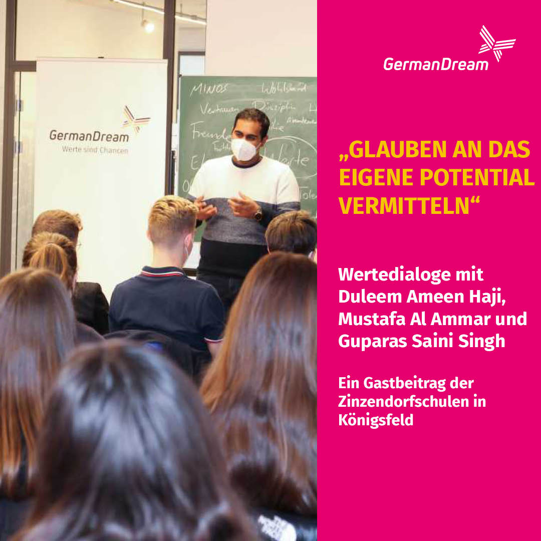 Die Wertebotschafter erzählten, warum sie trotz aller Hindernisse an ihr Potenzial geglaubt und ihre Träume nie aufgegeben haben. Mit den Wertedialogen will die Berliner Bildungsinitiative GermanDream Jugendliche und junge Erwachsene dazu anregen, ebenfalls an sich zu glauben. Die Gründerin der überparteilichen Organisation, Düzen Tekkal, hatte festgestellt dass Chancengerechtigkeit, Bildungsaufstieg und Einwanderungsgesellschaft beziehungsweise Migration in der Diskussionslandschaft immer nur negativ konnotiert waren. Sie sieht Deutschland als ein Land der Chancen und versteht sich selbst als einen gelebten „German Dream“. Für die Arbeit der Bildungsinitiative stehe die freiheitlich-demokratische Grundordnung an oberster Stelle. „An den Werten des Grundgesetzes festhalten, bedeutet an eine Gesellschaft glauben, die ein starkes Fundament für jede Einzelne und jeden Einzelnen bereitet. Diese Werte sind unser gemeinsamer Nenner und gewährleisten, dass wir alle – egal wo wir herkommen und wie wir unser individuelles Glück definieren – frei genug sind, um uns zu verwirklichen.“ Deshalb endete auch jeder der Wertedialoge mit § 1 des Grundgesetzes.