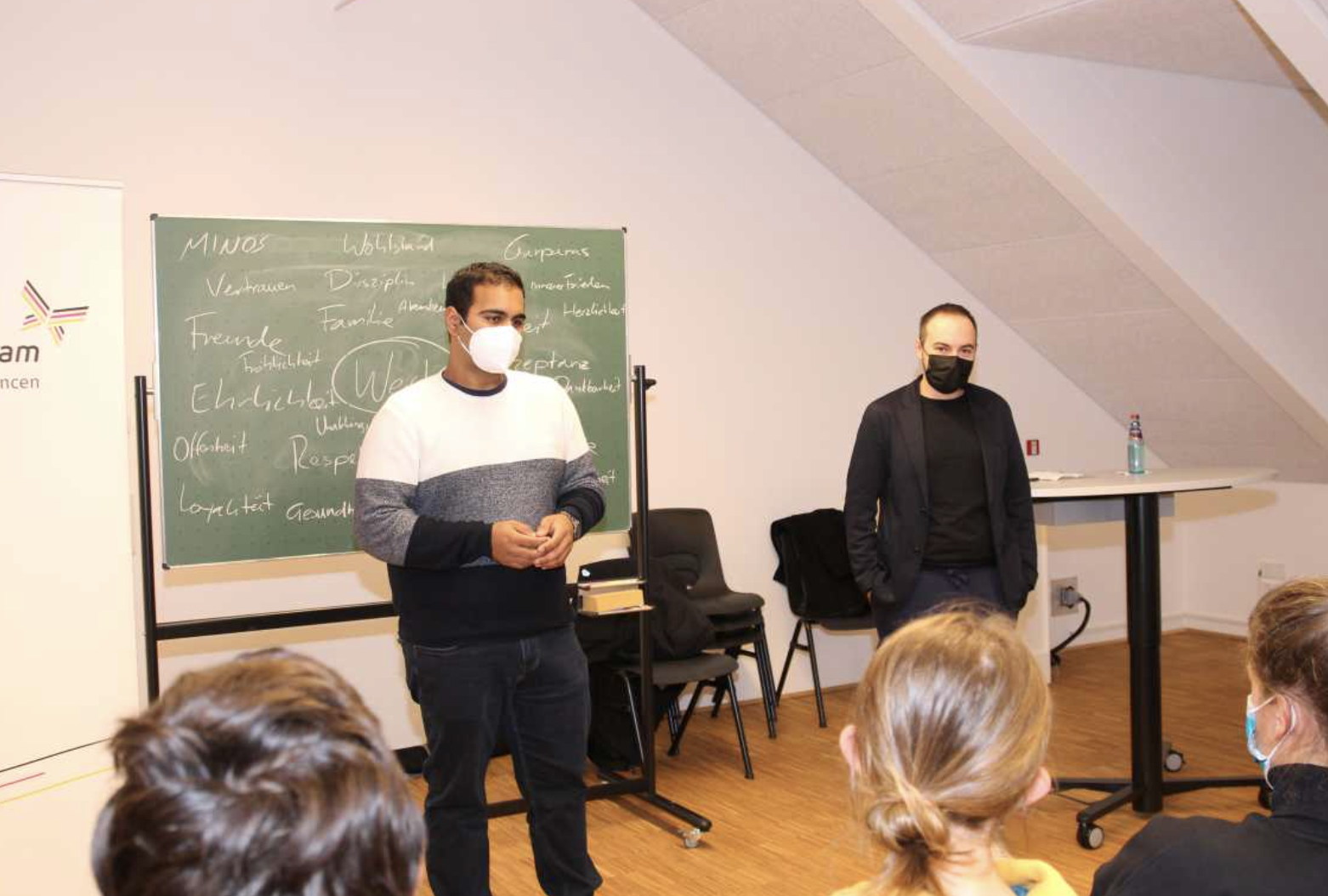 In verschiedenen Gruppen trat jeweils ein Wertebotschafter mit den Jugendlichen und jungen Erwachsenen in einen Dialog, in dem es um Themen wie Rassismus, Diskriminierung und Gleichberechtigung ging. Alle drei hatten unterschiedliche Biografien: Duleem Ameen Haji kommt aus dem Irak, wo er in Mosul sein Medizinstudium begann.