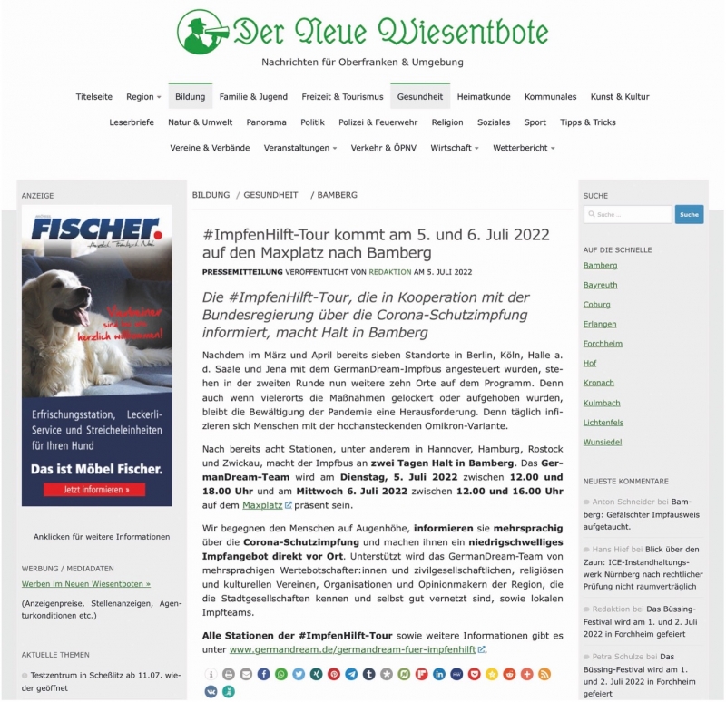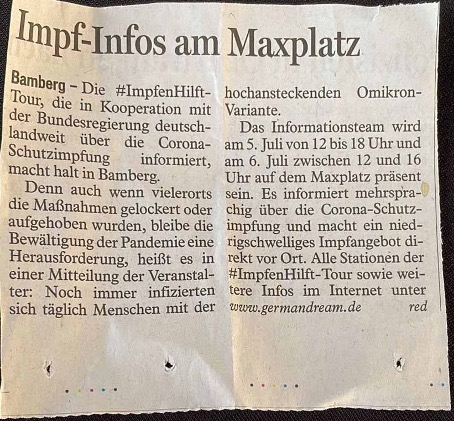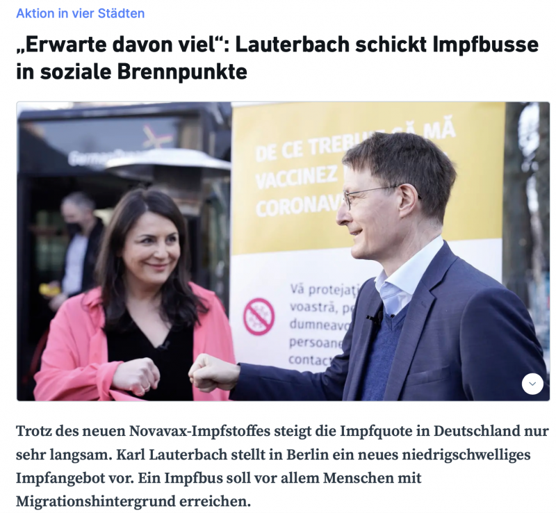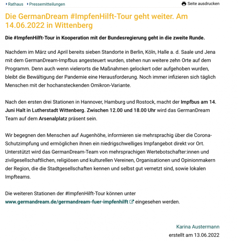 Ein besonderer Dank geht auch an das Rote Kreuz Berlin, die Markus Gemeinde in Berlin-Steglitz, unseren Projektpartner das Bundesgesundheitsministerium, MdB Dr. Karl Lauterbach, Dr. Eckart von Hirschhausen, Fotograf Jesco Denzel und Videoteam Luk und Simon sowie allen Städten und Gemeinden, die uns bei unserer Tour unterstützen.