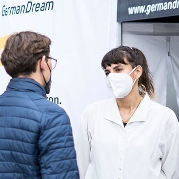 Pour continuer à attirer l’attention sur la vaccination contre la Covid-19, nous nous inspirons des succès de la tournée de vaccination 2022 afin d’atteindre les personnes sur place, dans leur cadre de vie – à bas seuil et en plusieurs langues ! L’année dernière, le bus « ImpfenHilft » de l’initiative éducative s’est rendu, en tout, à 40 endroits situés dans toute l’Allemagne. Les ambassadeurs de valeurs de GermanDream rencontrent les gens sur un pied d’égalité et parlent avec eux de la vaccination contre la Covid-19, de leurs doutes et de leurs inquiétudes.