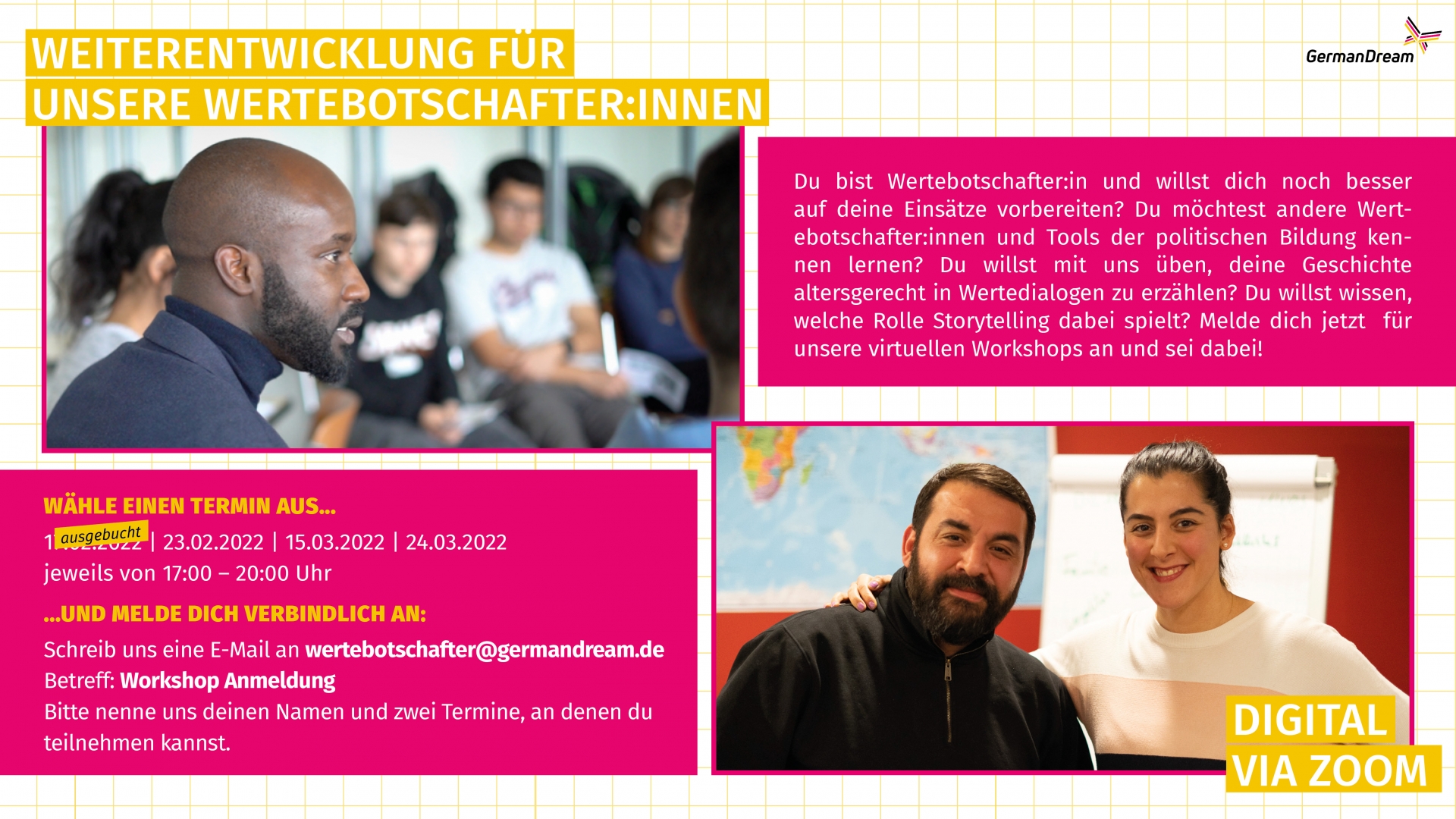 Um euch verbindlich anzumelden, schickt eine Mail an wertebotschafter@germandream.de mit eurem Namen und eurem Wunschtermin sowie einem Alternativdatum. Nutzt dafür den Betreff „Workshop Anmeldung“. Wir können leider nur Anmeldungen berücksichtigen, die über die Mailadresse eingegangen sind.