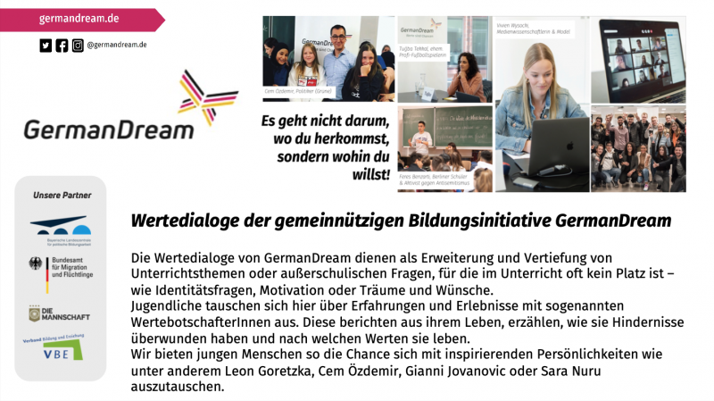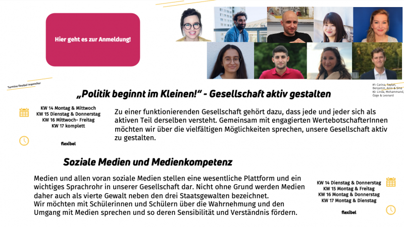Unsere virtuellen Wertedialoge sind weiterhin flexibel anpassbar, sind mit keinen Kosten für euch verbunden und unkompliziert in ihrer Organisation und Durchführung.