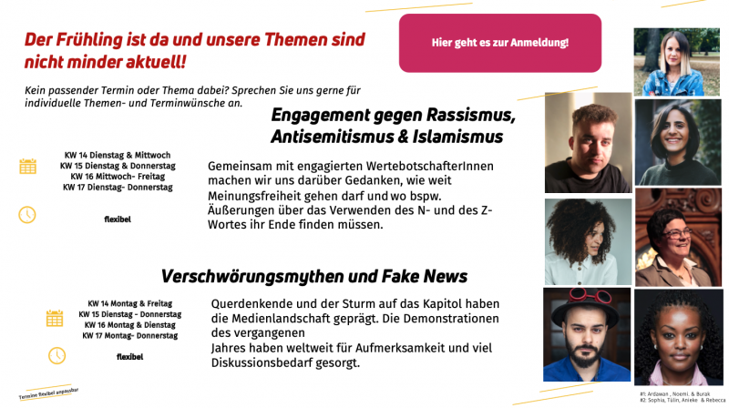 Im April gehen wir in unseren virtuellen Wertedialogen aktuellen und spannenden Fragen nach: Wie gehen wir mit Populismus, Fake News oder Verschwörungsmythen bestmöglich um? Wie können wir Gesellschaft aktiv gestalten? Und was können wir tun, um uns anti-rassistisch zu positionieren?