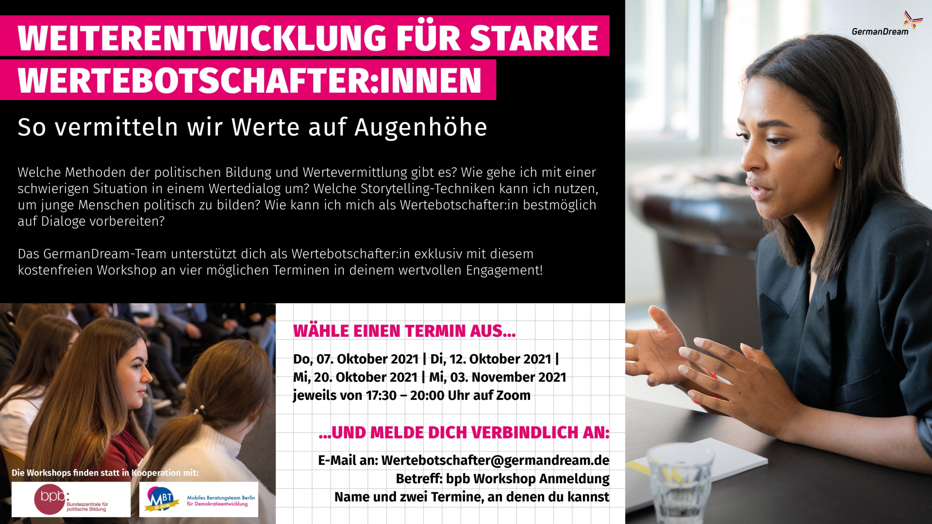 Um euch verbindlich anzumelden, schickt ihr uns am besten eine Mail an wertebotschafter@germandream.de mit eurem Namen und eurem Wunschtermin sowie einem Alternativdatum. Nutzt dafür den Betreff „bpb Workshop Anmeldung“.